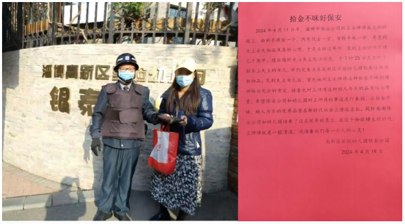 4月11日,市保安公司高新區(qū)銀泰城幼兒園項(xiàng)目部保安隊(duì)員王永上班路上撿到手提袋一個(gè),四處找尋無(wú)果后,打開查看包內(nèi)有手機(jī)和少量現(xiàn)金,通過電話聯(lián)系找到失主,最終歸還遺失物品。失主家人拿到失而復(fù)得的財(cái)物后,十分激動(dòng)并專門送上感謝信對(duì)其表示感謝。